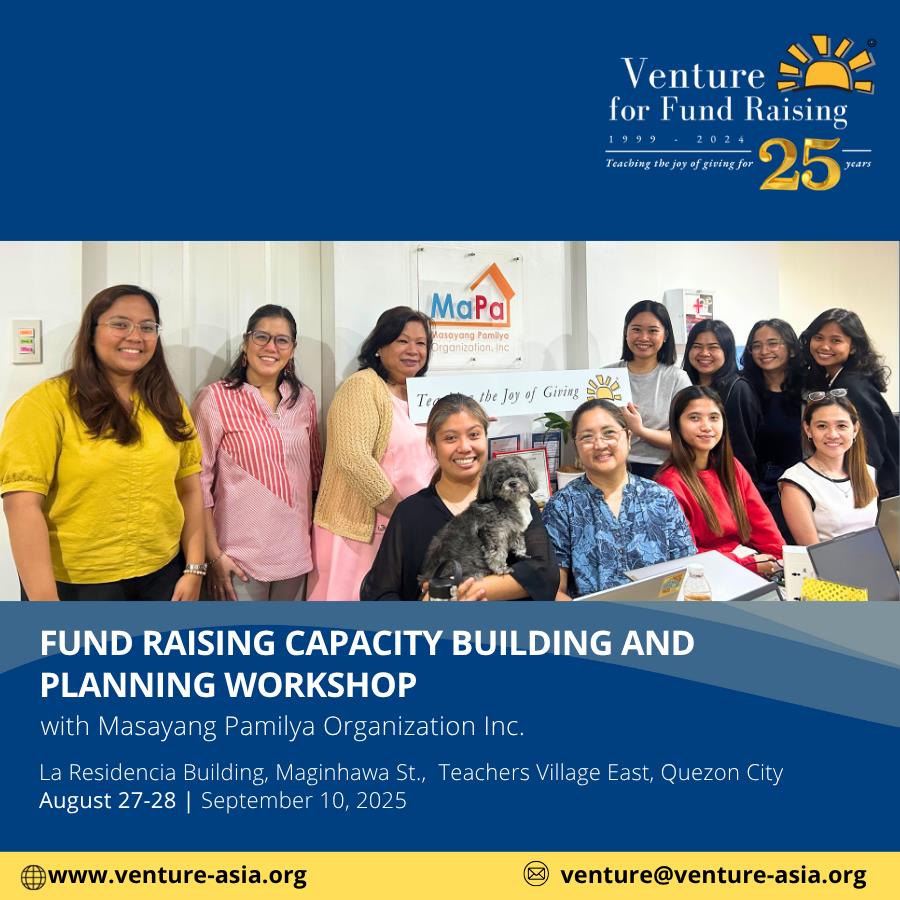 Together with Masayang Pamilya Organization, Venture successfully wrapped up a Fund Raising Capacity Building and Planning Workshop in Quezon City last August 27-28, and September 10, 2025. The workshop covered essential fund raising concepts, introduced a comprehensive set of fund raising strategies relevant to children- and family-focused programs, and guided participants through the process of developing a fund raising plan.